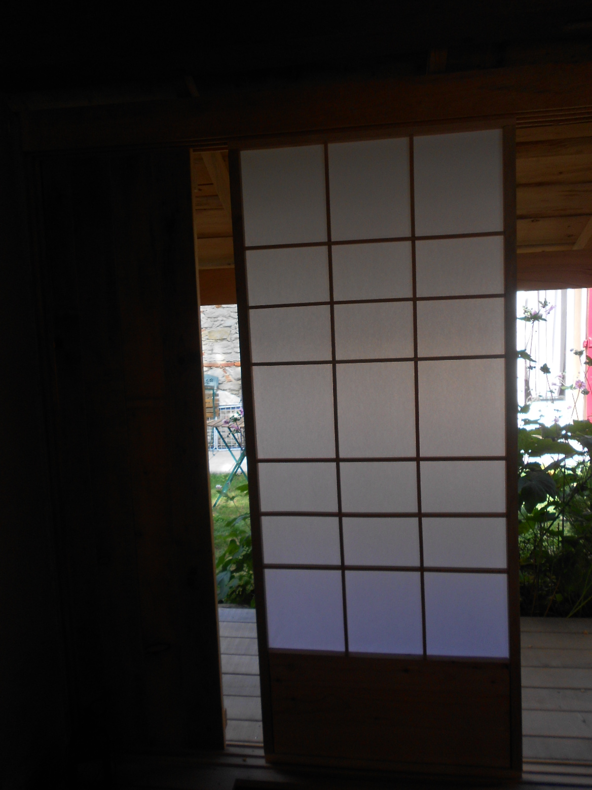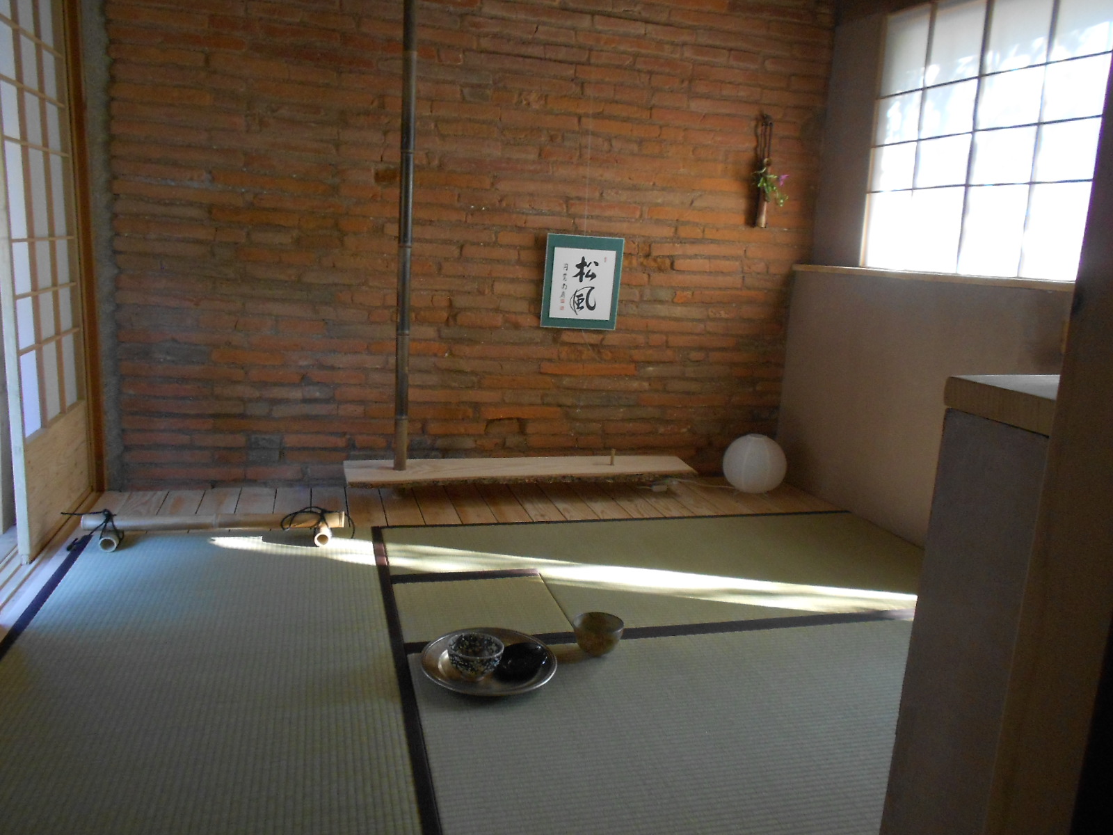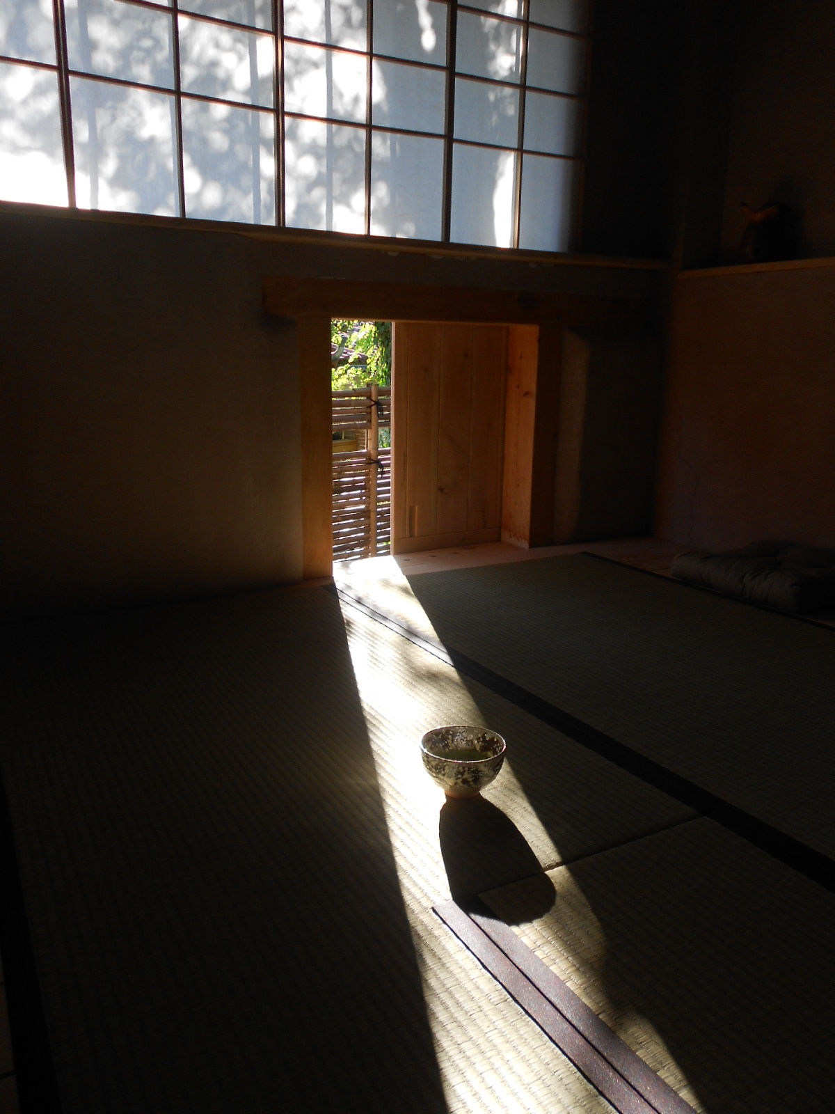 Les 19 et le 20 septembre 2015, après quatre années de préparatifs , le Pavillon des Nuages Un-Yû-An est enfin prêt à accueillir ses premiers invités. Et pour l’occasion, mes amies japonaises Kumiko et Keiko, de l’école de thé Sôhen Ryu Yohôan dont je dépend, n’hésitent pas à parcourir les 12000 km qui nous séparent du Japon, afin de m’assister tout au long de ces grandes journées d’inauguration. Les invités, amis et famille, se succèdent au cours de ces deux jours, par petits groupes de 3 à 5 personnes. Les sandales de paille « zôri » sont disposées avec soin dans la maison, et ce n’est qu’une fois chaussé de ces sandales que l’invité pénètrera dans le « roji » par le petit portillon, et que débutera le voyage, en compagnie de Kumiko, de Keiko ou de moi-même.