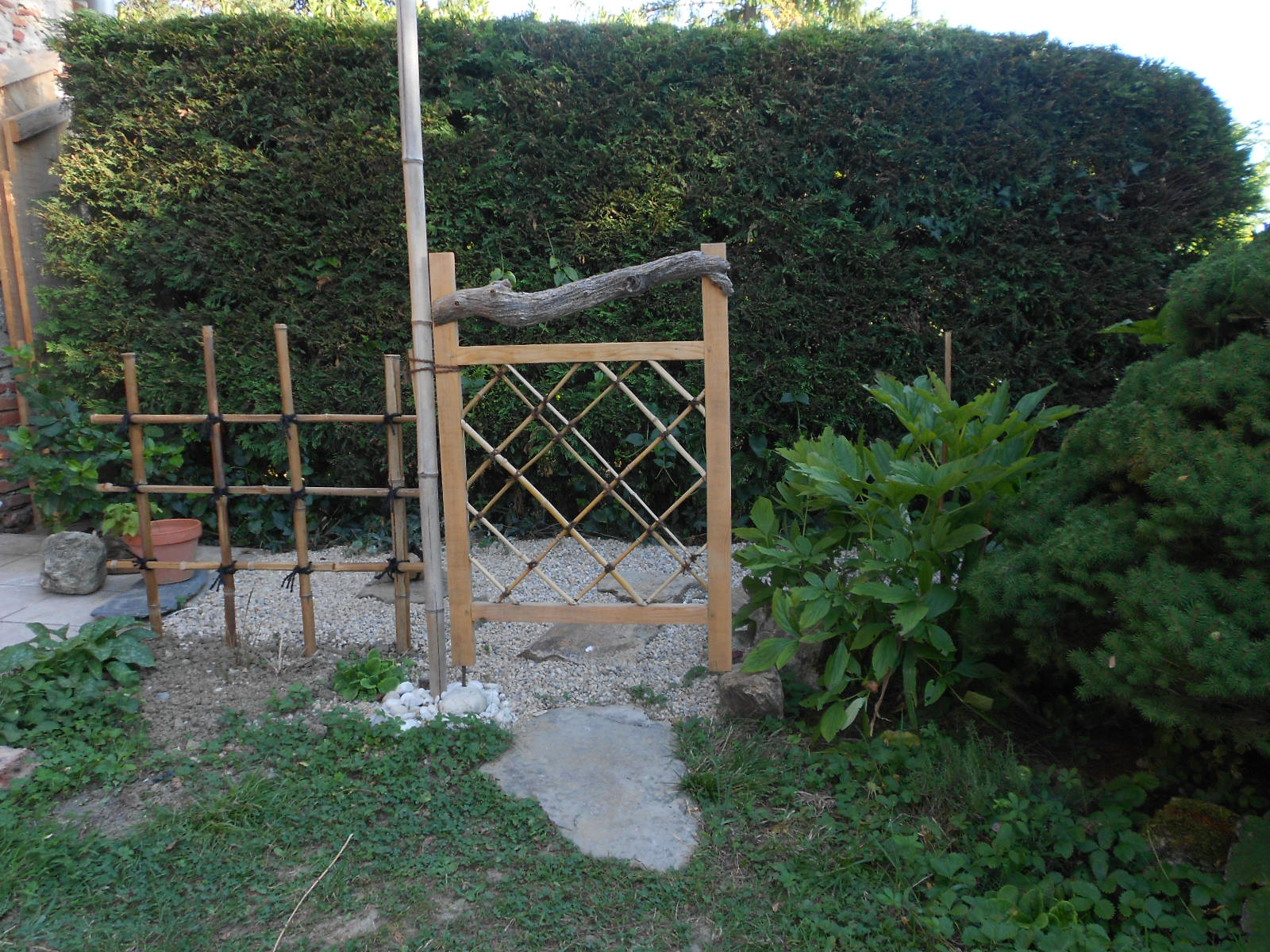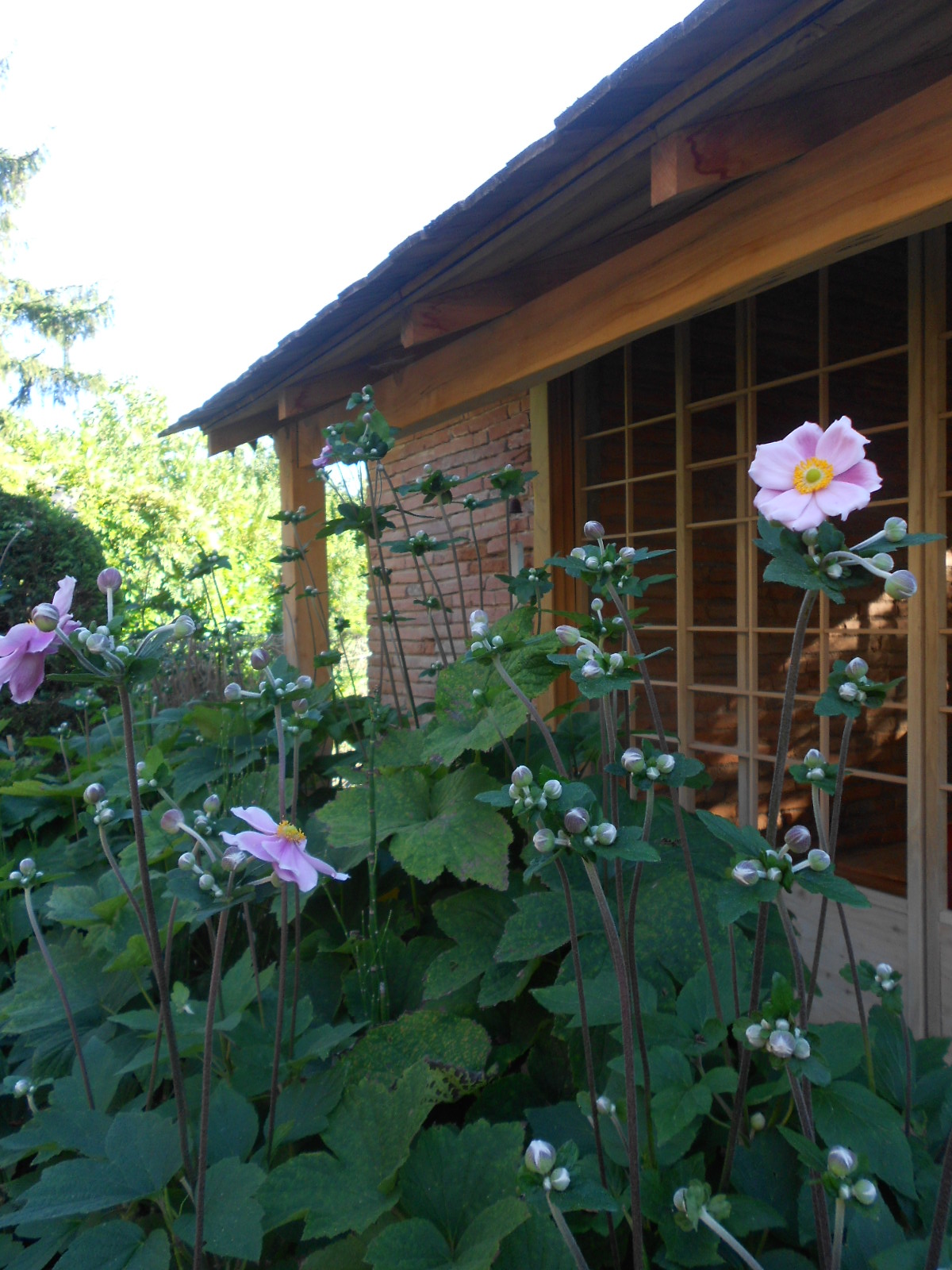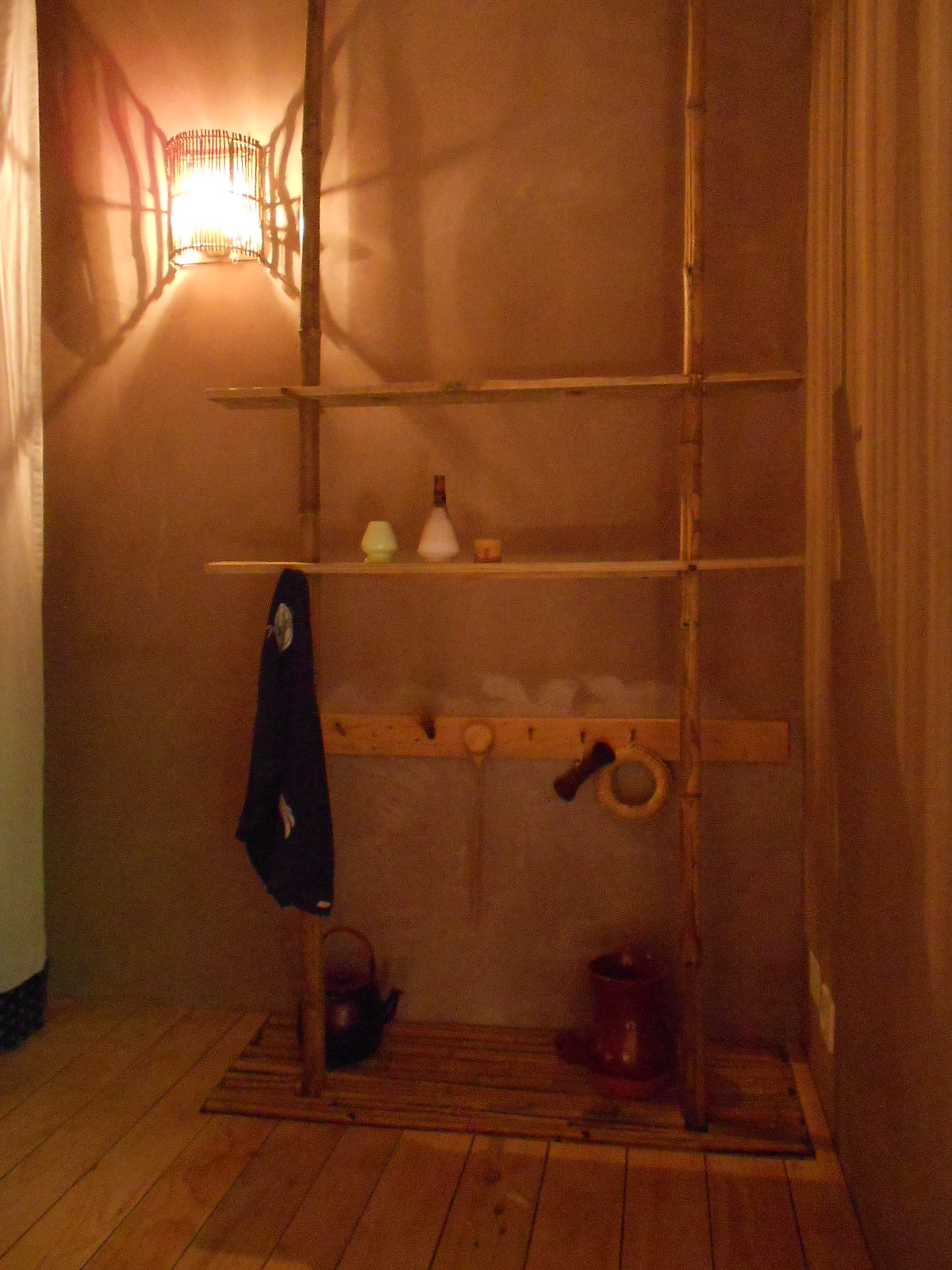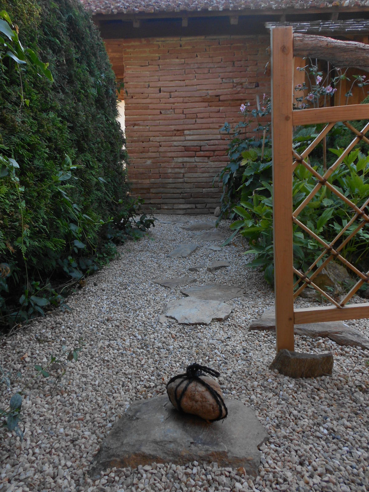 Les 19 et le 20 septembre 2015, après quatre années de préparatifs , le Pavillon des Nuages Un-Yû-An est enfin prêt à accueillir ses premiers invités. Et pour l’occasion, mes amies japonaises Kumiko et Keiko, de l’école de thé Sôhen Ryu Yohôan dont je dépend, n’hésitent pas à parcourir les 12000 km qui nous séparent du Japon, afin de m’assister tout au long de ces grandes journées d’inauguration. Les invités, amis et famille, se succèdent au cours de ces deux jours, par petits groupes de 3 à 5 personnes. Les sandales de paille « zôri » sont disposées avec soin dans la maison, et ce n’est qu’une fois chaussé de ces sandales que l’invité pénètrera dans le « roji » par le petit portillon, et que débutera le voyage, en compagnie de Kumiko, de Keiko ou de moi-même.
