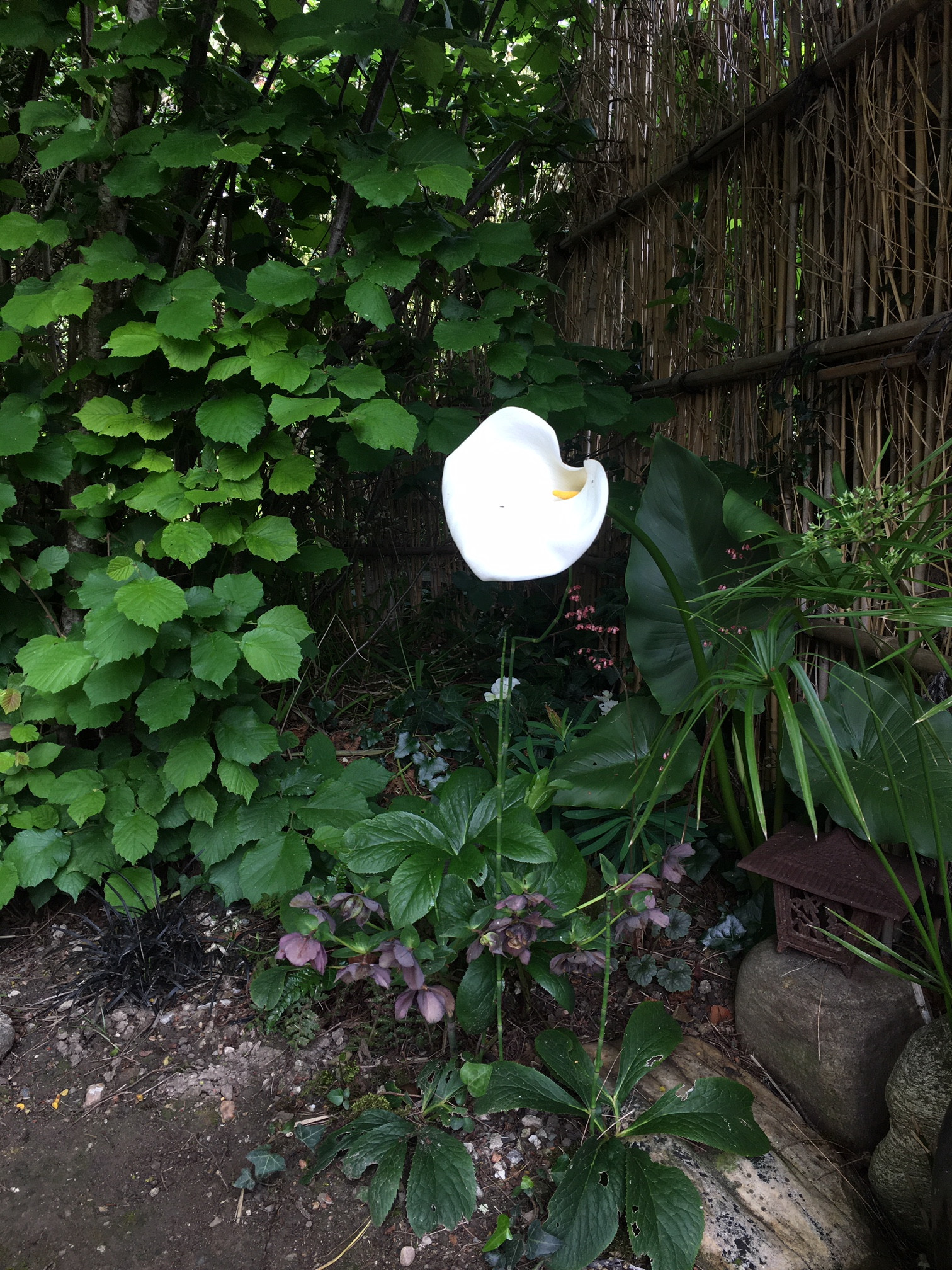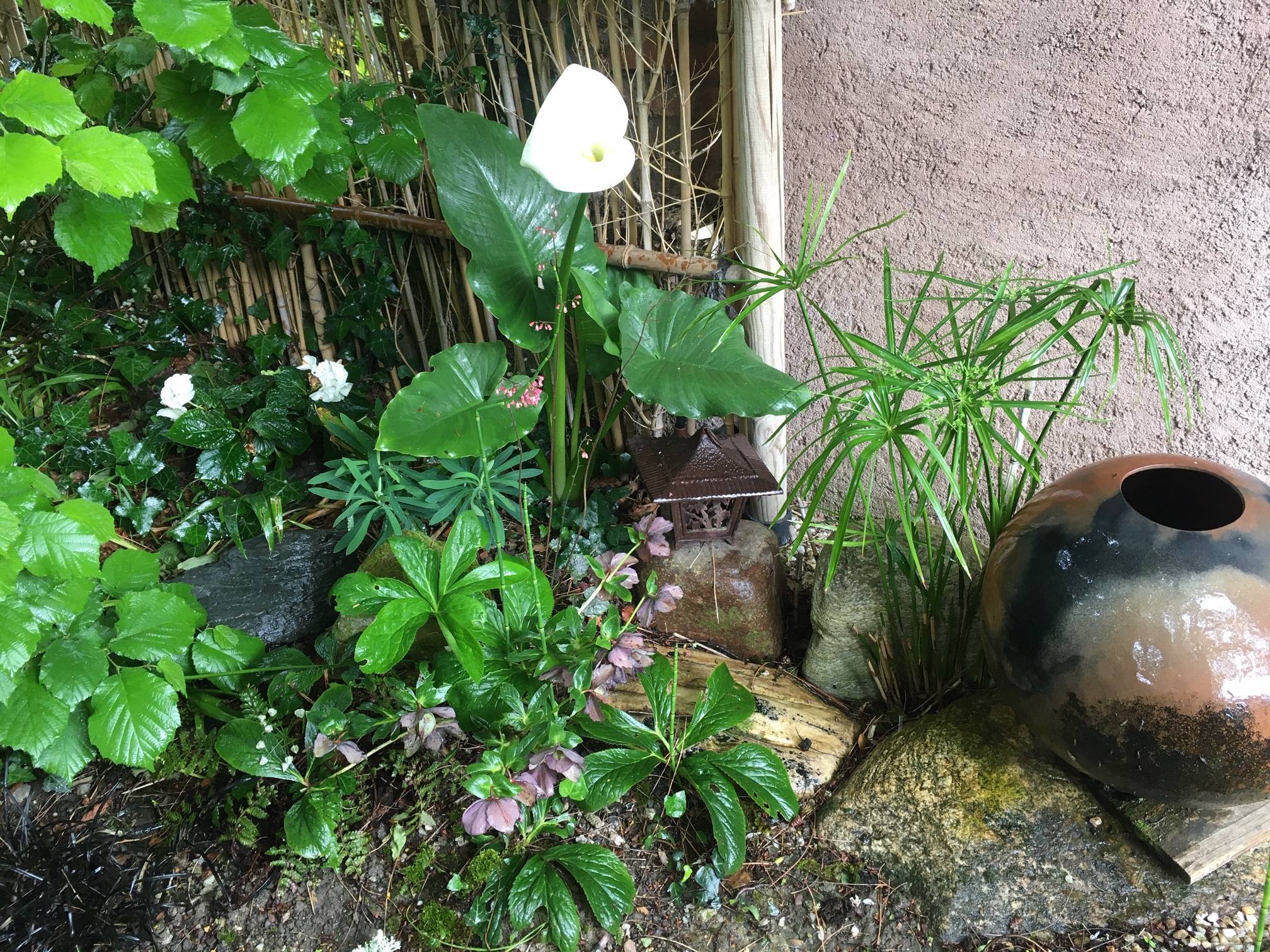 Le printemps cette année, c’est d’abord ce magnifique Arum qui est venu illuminer le tokonoma et le sous bois du tsukubai