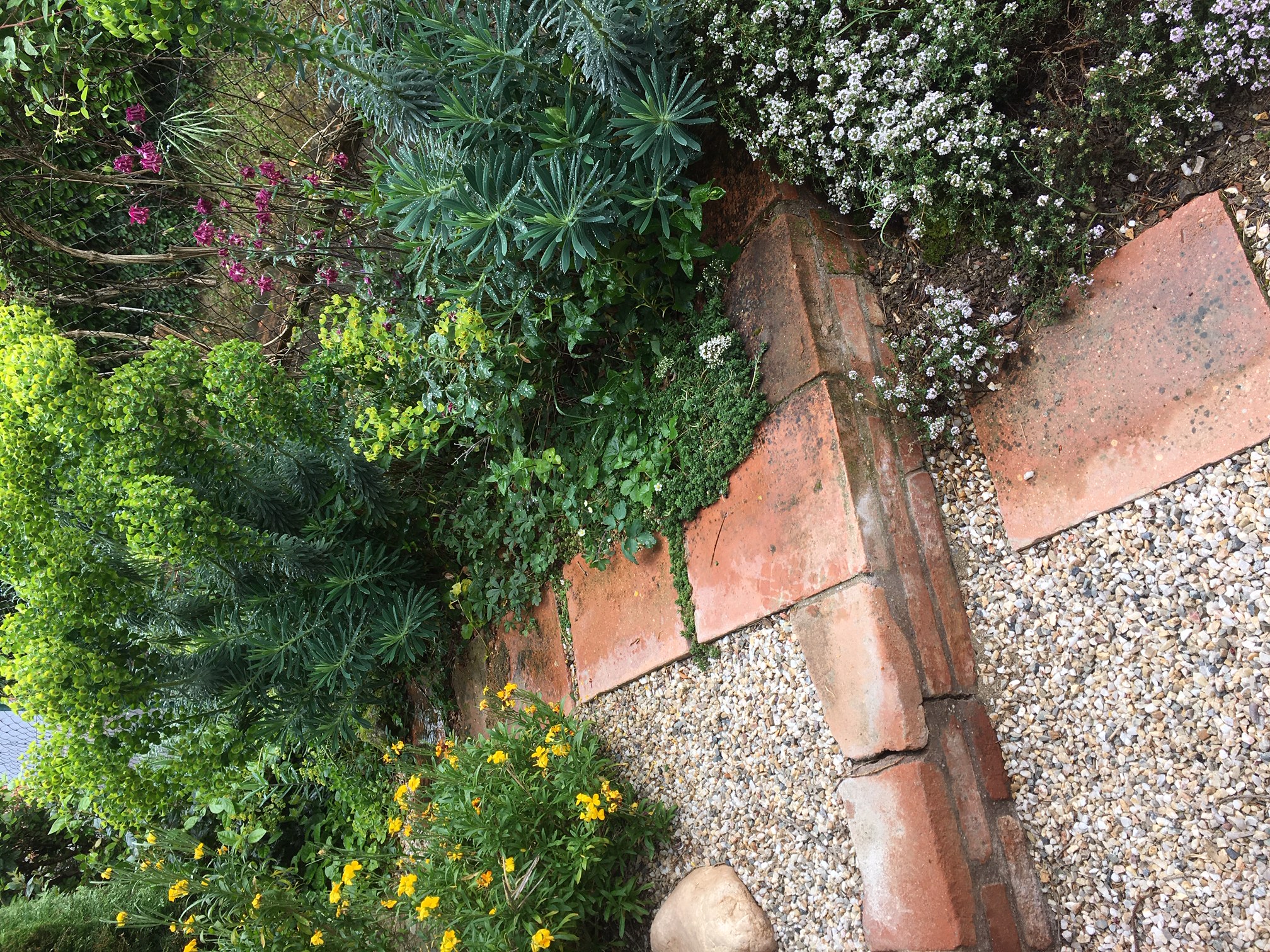 En Mai, c’est en toute confidentialité que le petit jardin qui borde le rôji s’est paré de jolies fleurs de thym, d’ancolies, d’euphorbes et giroflées…