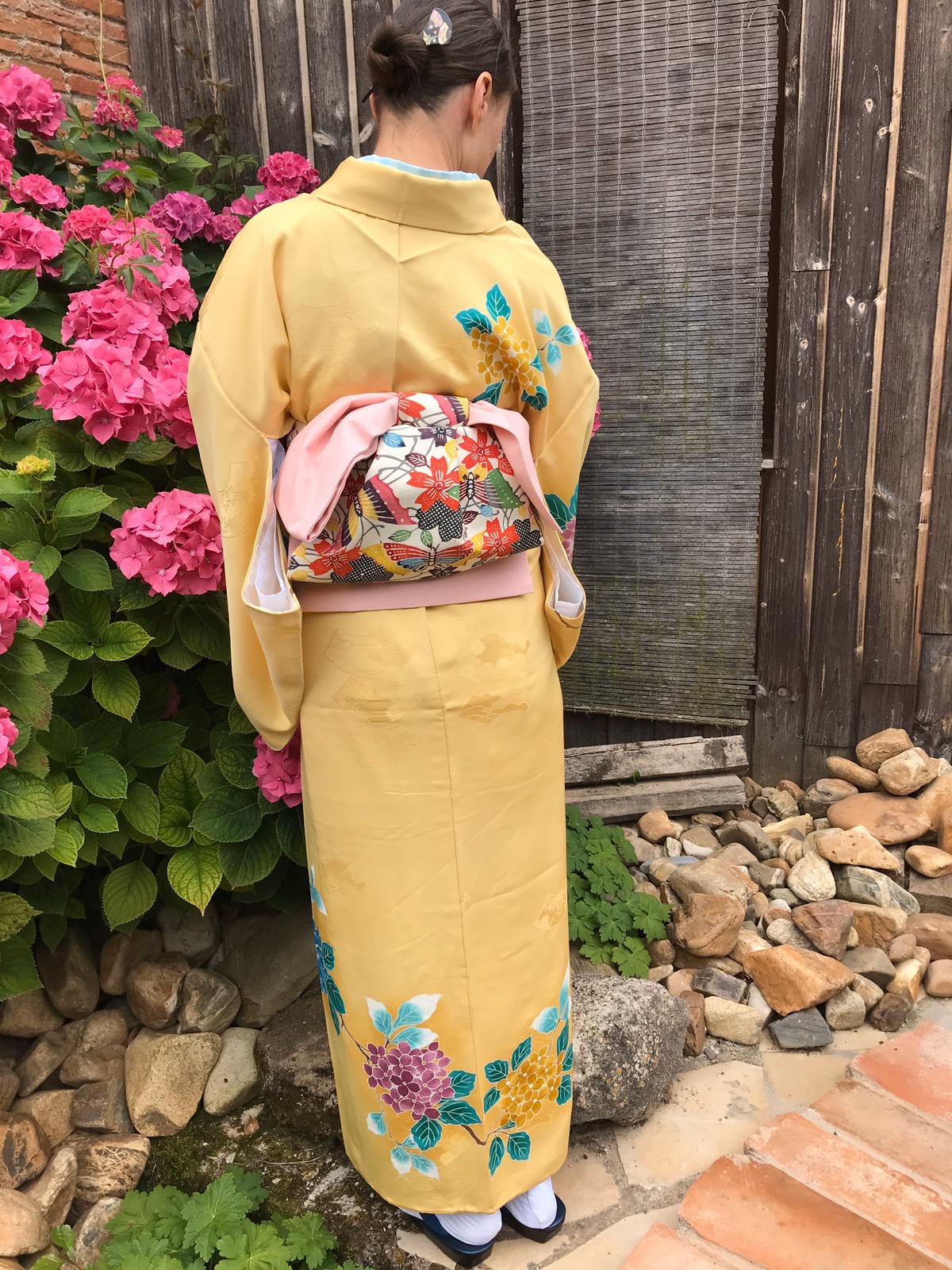 Quelques jours plus tard, en Juin, les hortensias annoncent fièrement le début de l’été. Anita s’en doutait, car c’est vêtue d’un ravissant kimono orné de ces mêmes fleurs qu’elle est venue pour sa leçon de thé.