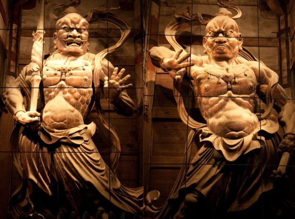 Si vous vous rendez dans un temple bouddhiste au Japon , vous remarquerez que de chaque côté de la grande porte se trouve la statue d’un personnage grand et costaud, un peu cousin de l’incroyable Hulk, debout, bras levés, regard menaçant, et bouche grande ouverte sur un cri pour l’un, lèvres pincées en une grimace pour l’autre.