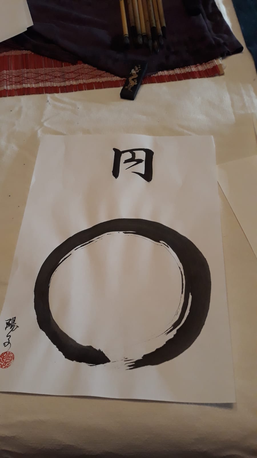 « En » , le cercle, signifie la liberté, l’impartialité, l’équité et l’intégrité de Bouddha. C’est le symbole de la réalité absolue et véritable, et donc de l’illumination. « Ensô » est un des sujets préférés de l’art zen, qui laisse entrevoir l’état d’esprit du calligraphe. Souvent réalisé d’un seul geste, en un seul trait de pinceau, la fin du geste essaie de rejoindre le début du tracé. Ainsi, « Ensô » tend à montrer que le monde est à la fois parfait et imparfait, ou parfaitement imparfait : c’est aussi le bol légèrement déformé dans lequel nous buvons le thé, que l’on dit avoir le goût du zen.