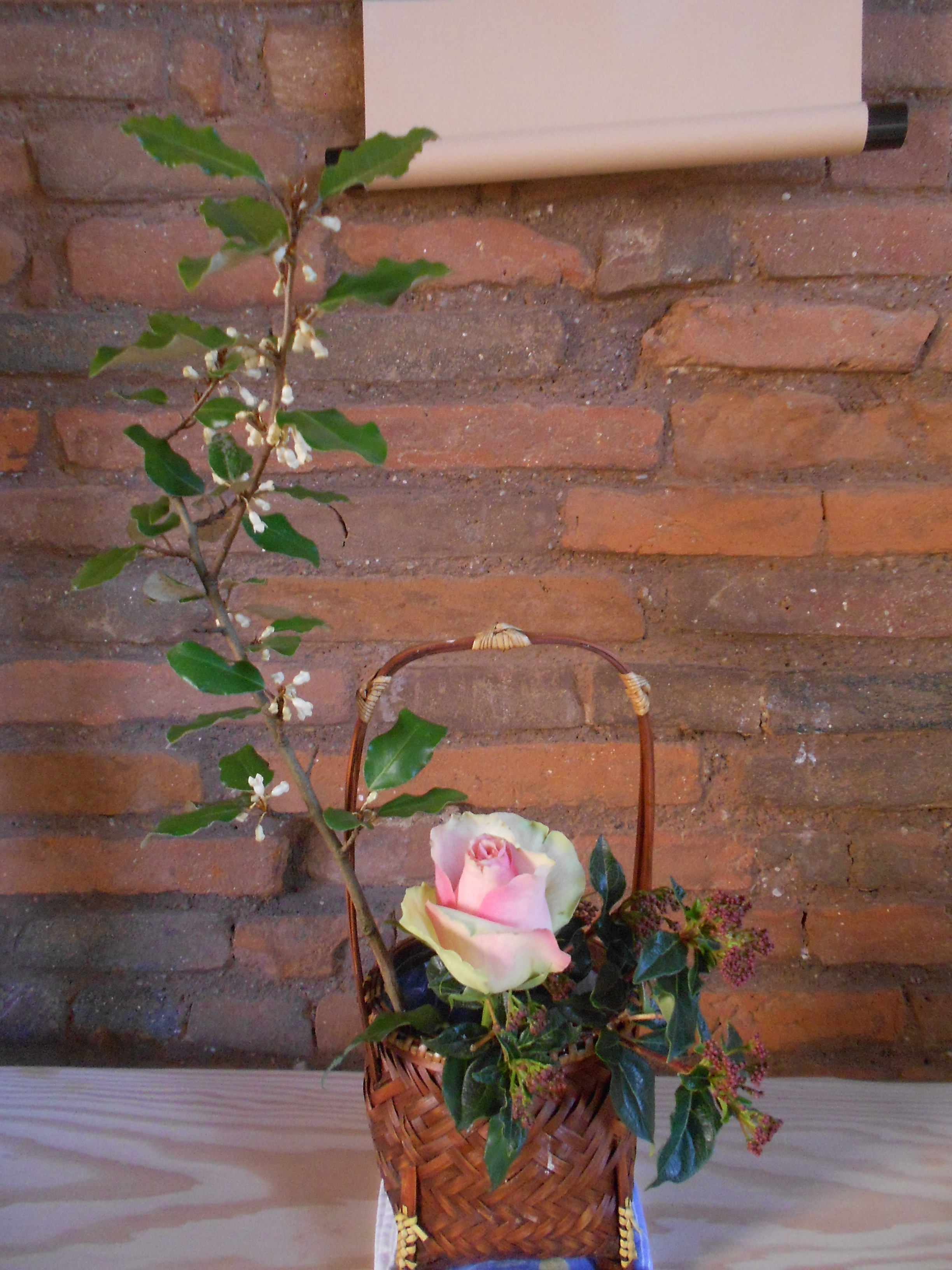Deux nouvelles propositions ont été faites par Danièle: un petit arrangement dans un vase en céramique réunissant divers branchages au choix; un freesia jaune et une feuille de fougère. Pour le deuxième chabana, un travail à réaliser dans un panier en bambou japonais, avec des tiges de mahonia à feuilles rouges, une branche de prunier sauvage et/ou une rose.