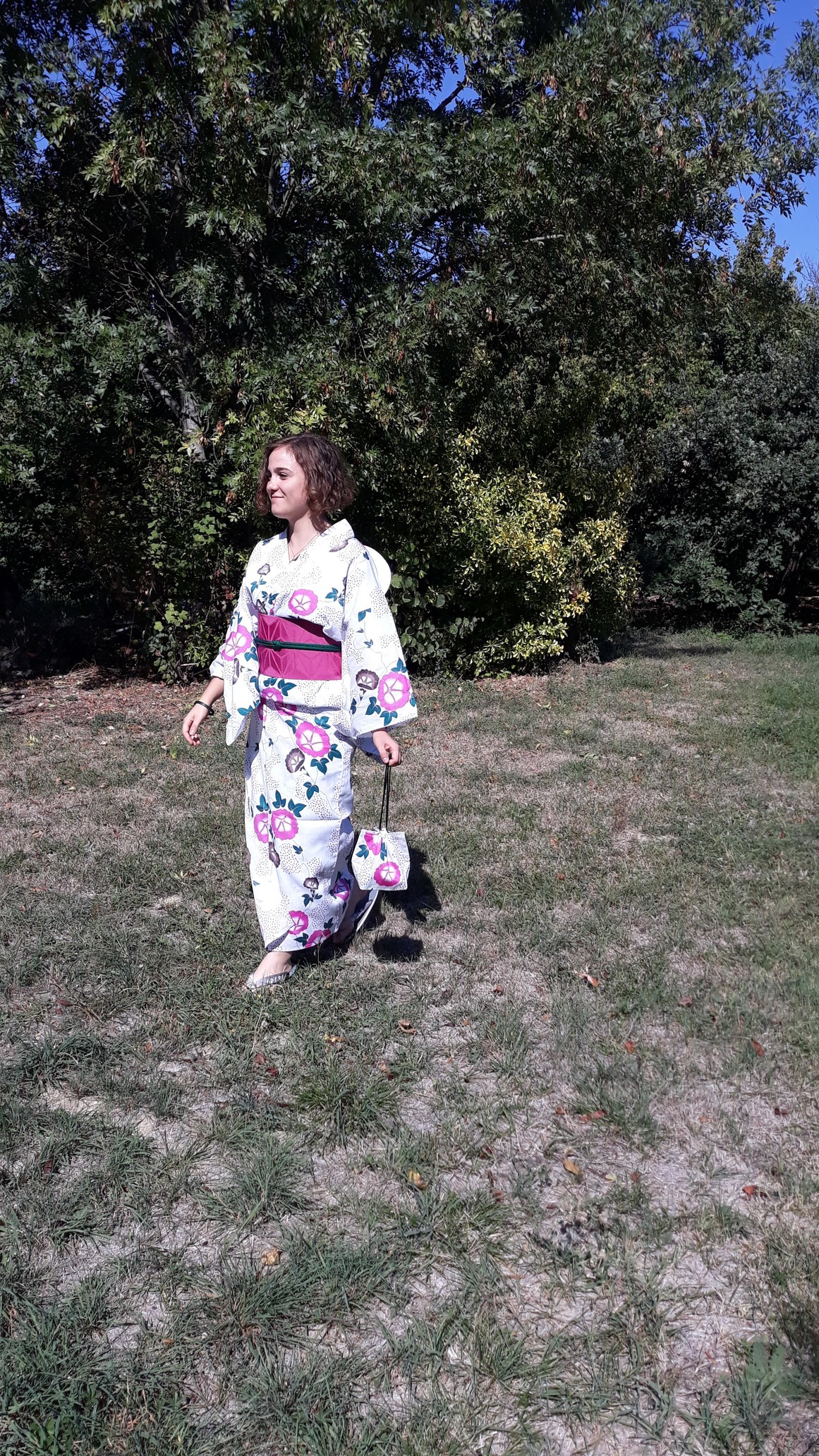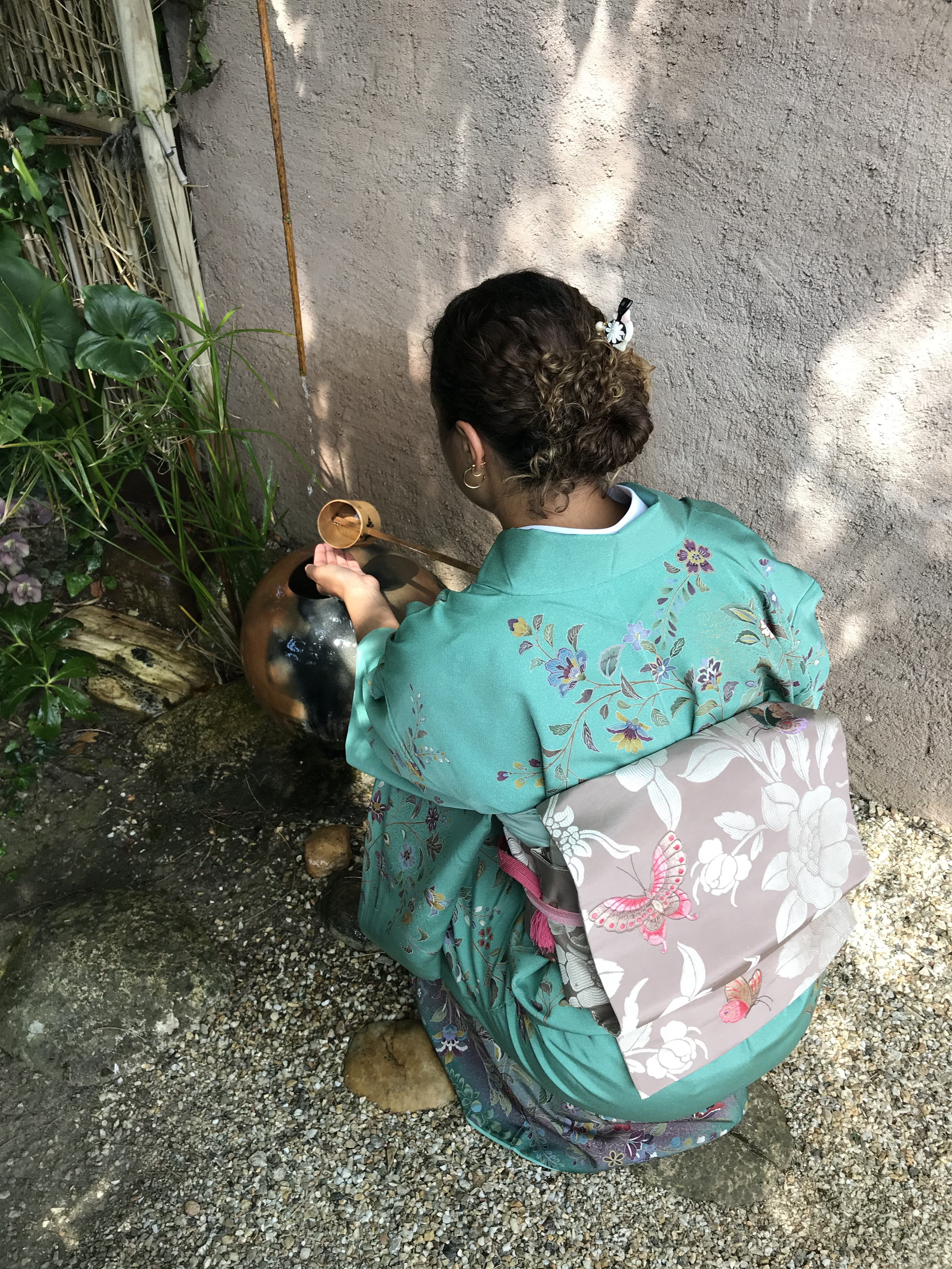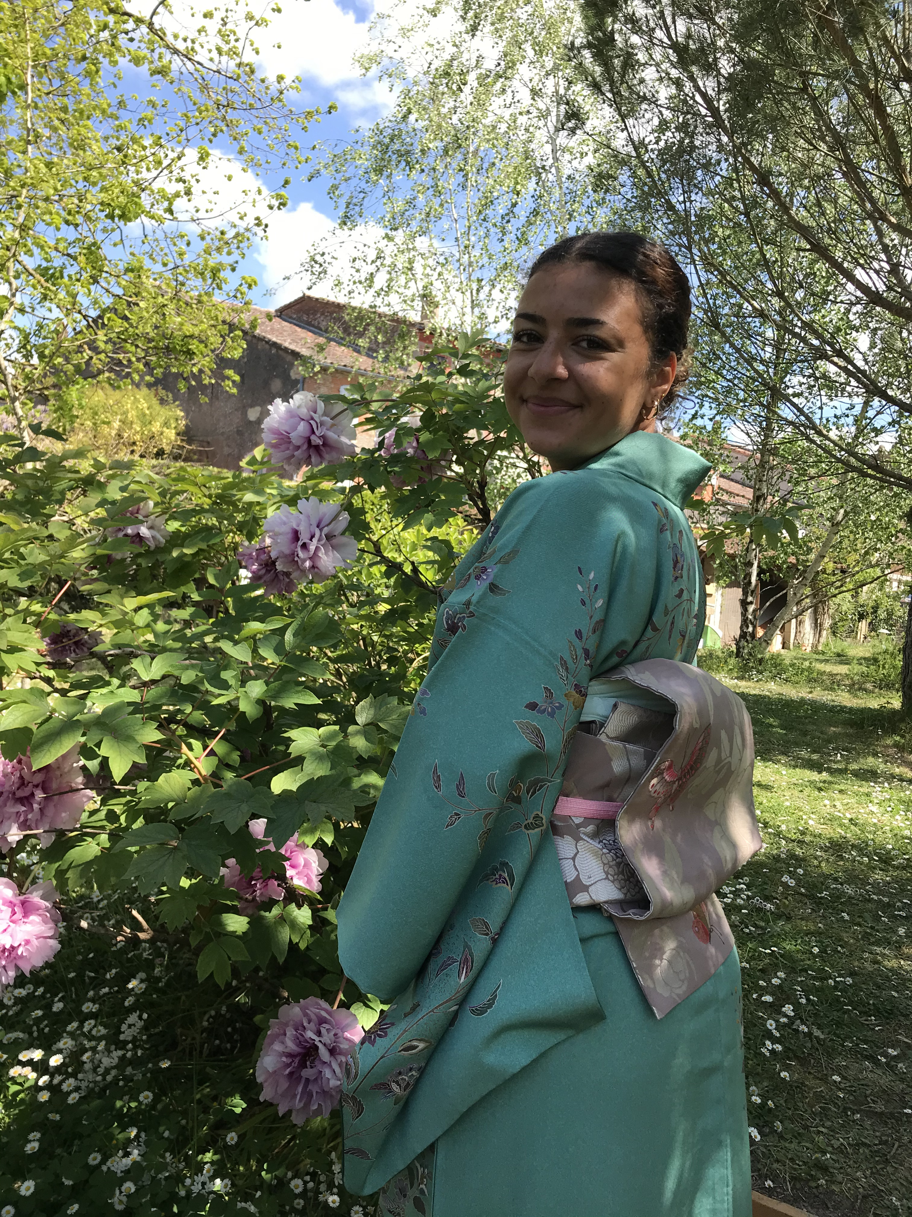 ELODIE : Kimono Hômongi en soie bleu ciel, qui attire le regard avec ses grues aux plumes brodées, qui survolent les montagnes bleues 青山… comme dans un dessin animé de MIYAZAKI Hayao… Anita lui a noué la ceinture en GINZA Musubi pour lequel on n’utilise pas de Makura, (le petit coussin), traditionnellement utilisé pour les ceintures de kimono…C’est un Fukuro Obi en soie tissée avec le motif Tsujigahana*, une magnifique guirlande de fleurs brillant sous les reflets de ce soleil de fin d’année.