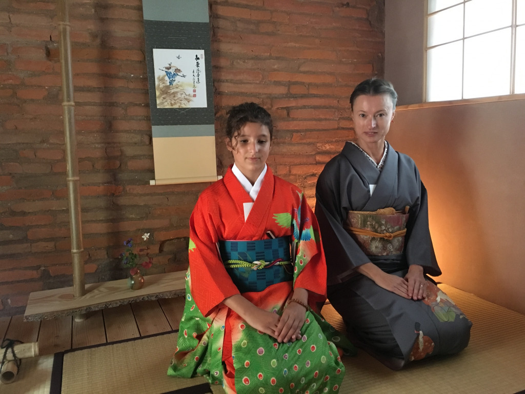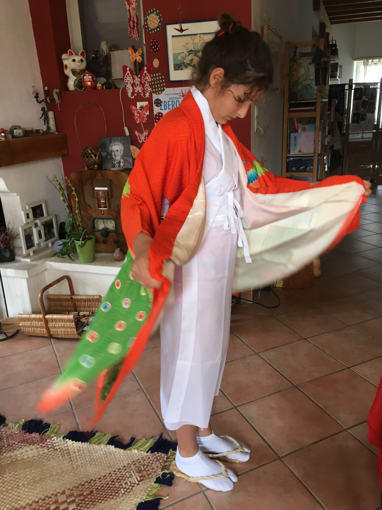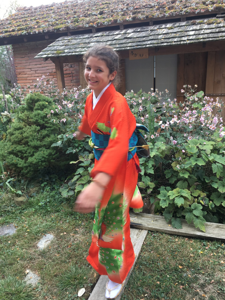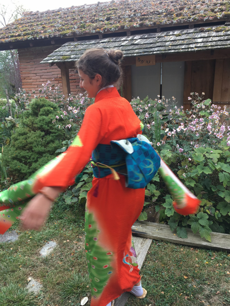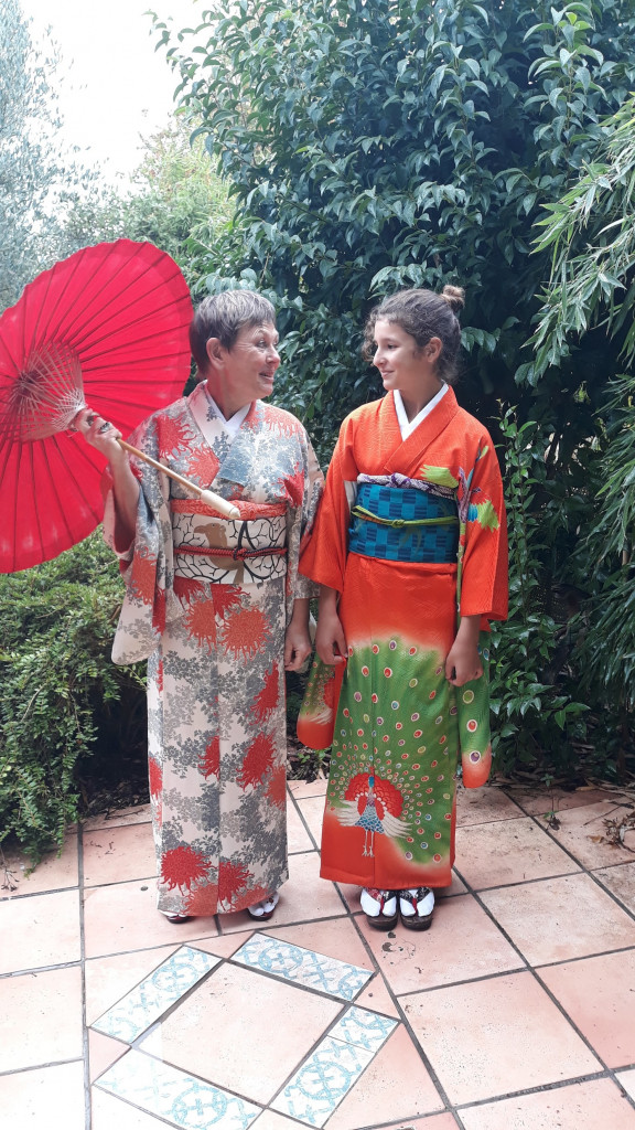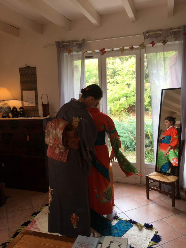 CORINNE est de retour pour une nouvelle expérience d’art du kimono. Elle est déjà beaucoup plus autonome et arrive sans l’aide d’Anita à revêtir le sous-kimono, superposer les pans de kimono et garder les lignes horizontales… Le progrès est net ! C’est encourageant !
