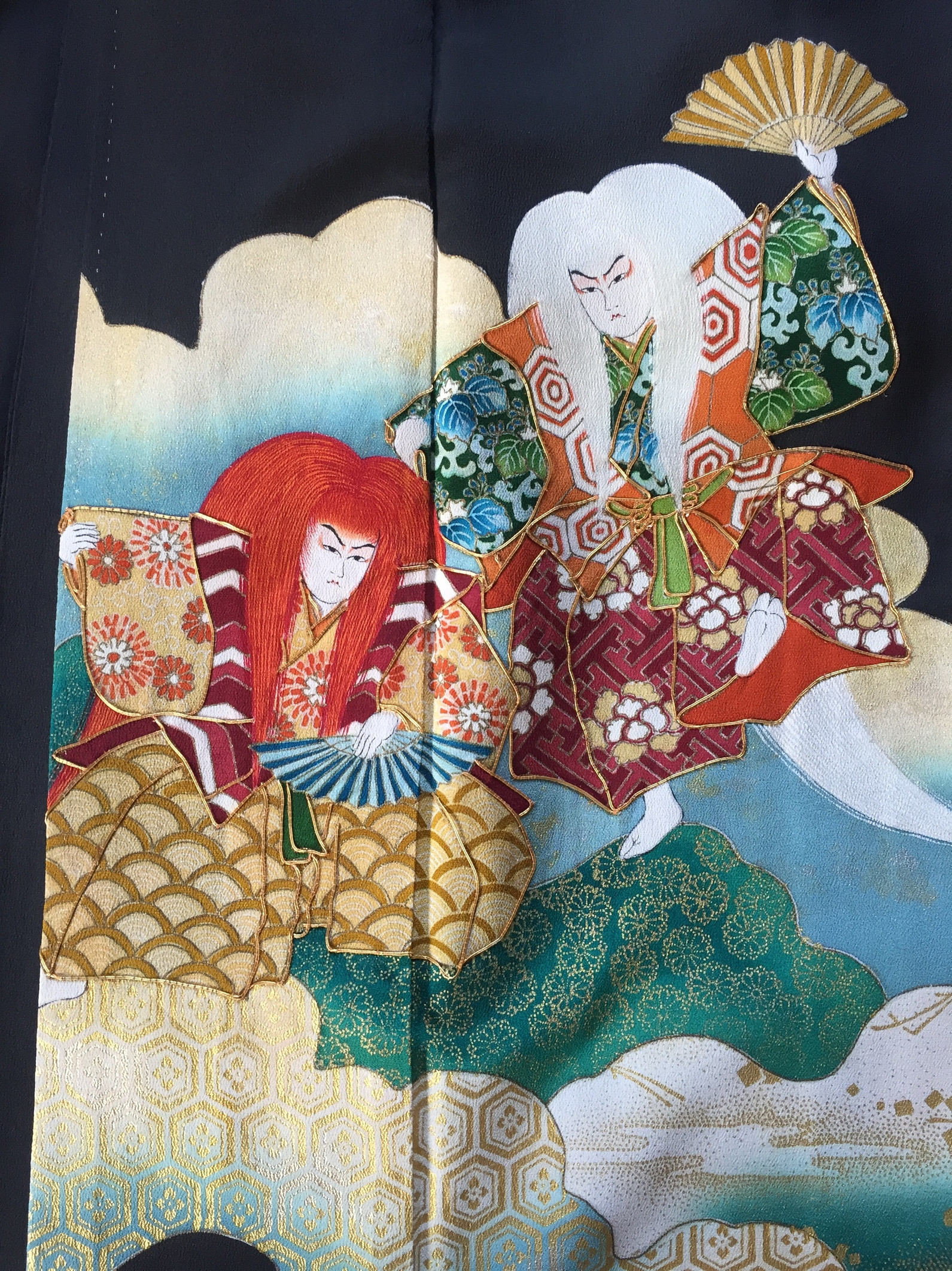 Le motif de ce kimono représente les acteurs de Kabuki 歌舞伎.