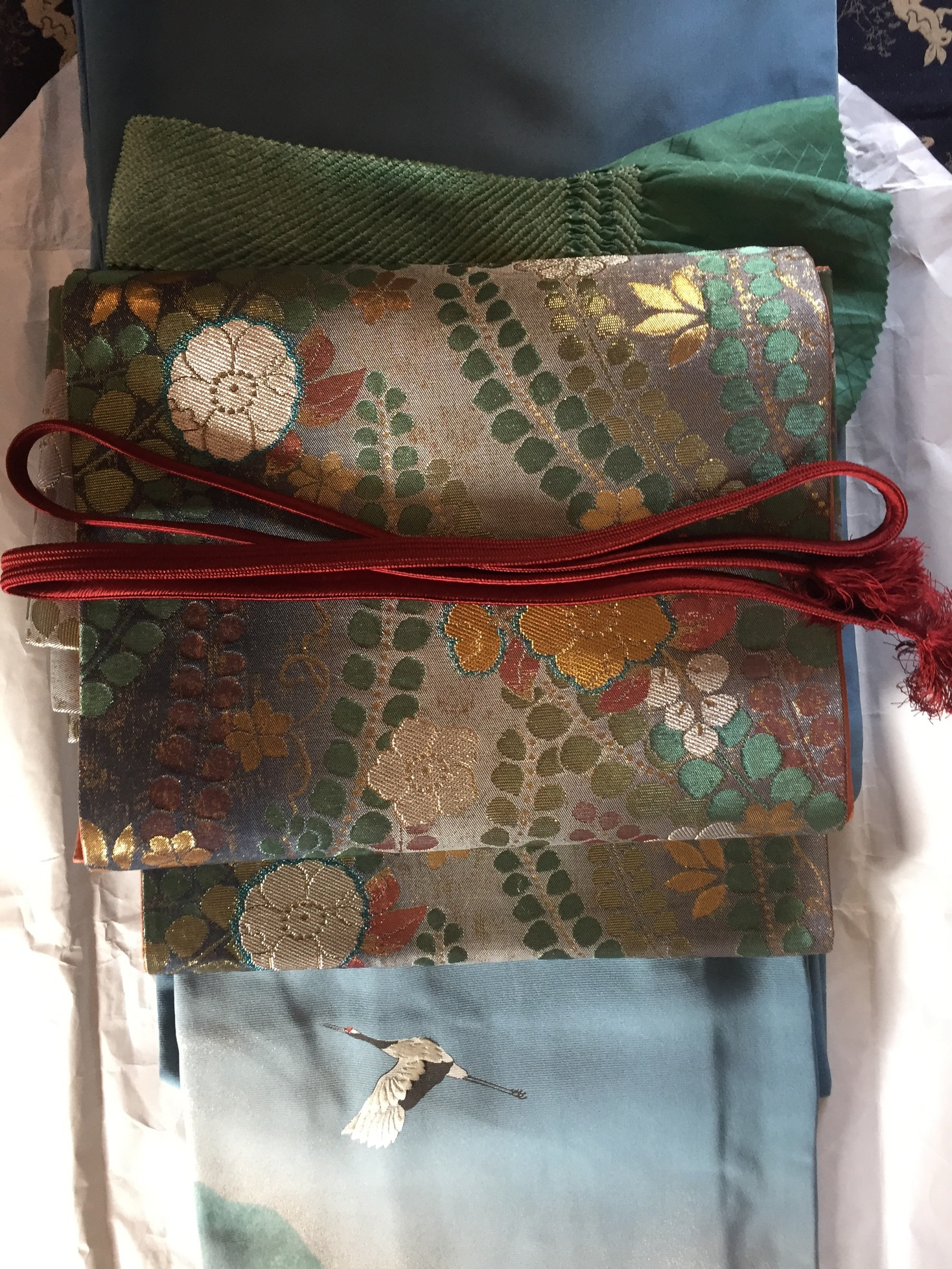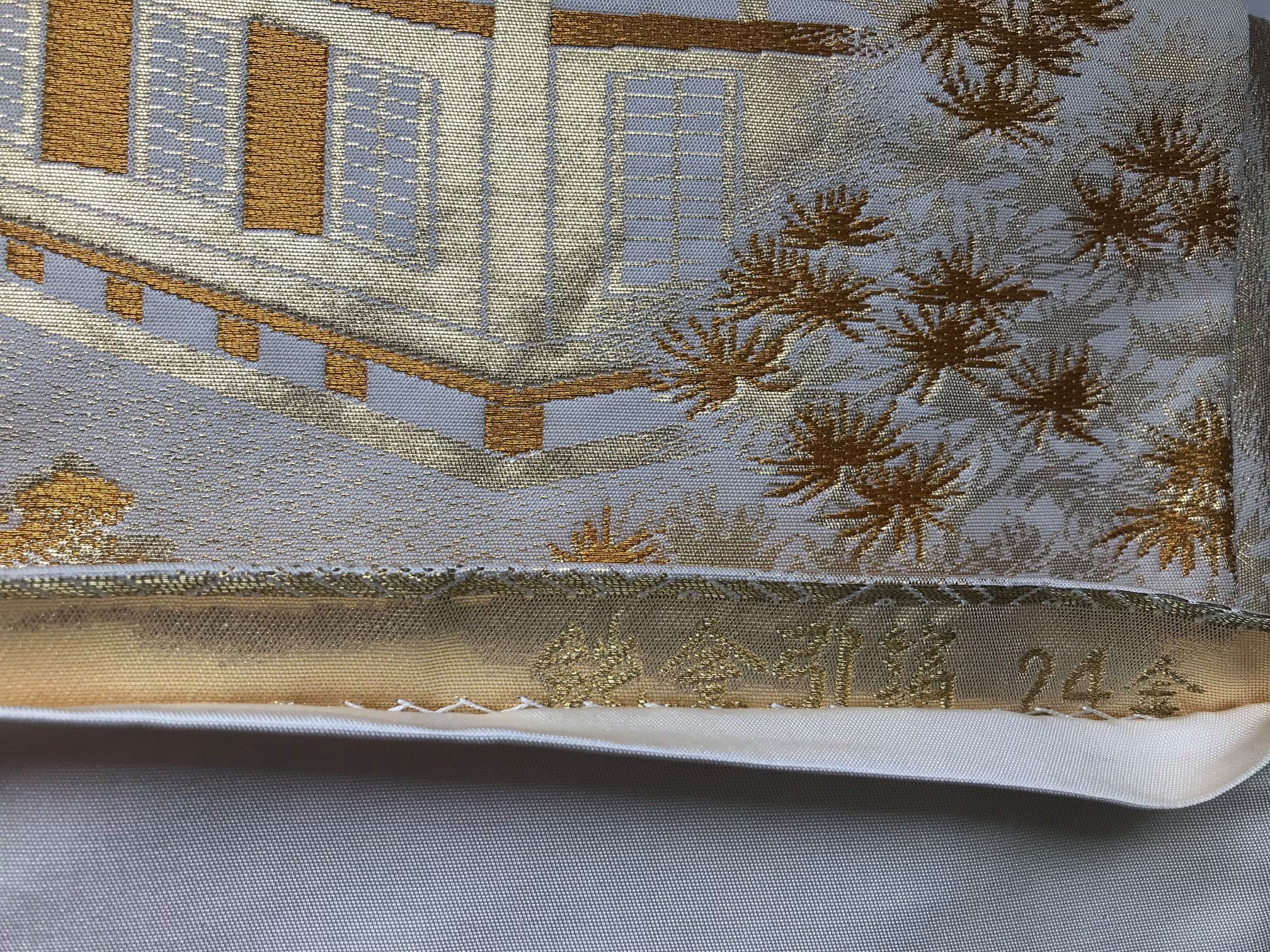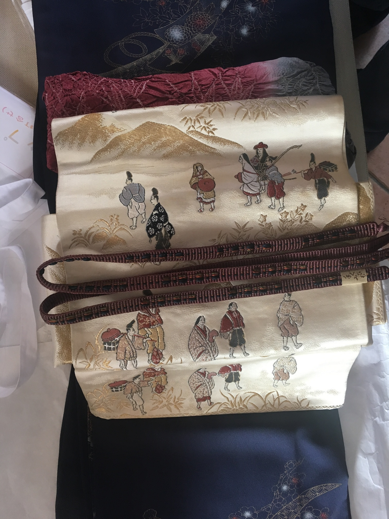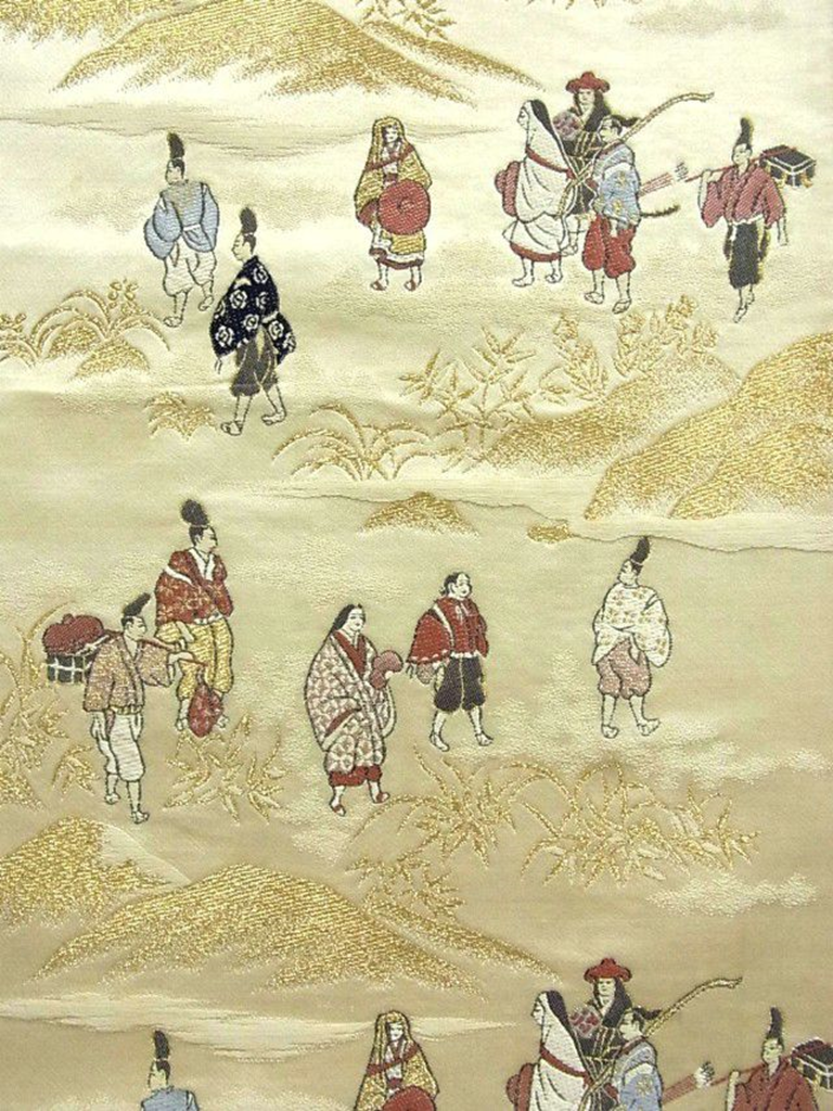 Pour accompagner ce kimono, la maman d’Elodie a choisi un Fukuro Obi en soie mate, couleur or avec des motifs tissés représentant les voyageurs des temps anciens. Les fils d’or, rouges et bleu font écho aux couleurs des motifs du kimono. Cet ensemble est d’une harmonie exquise pour ce dernier partage du thé de l’année…