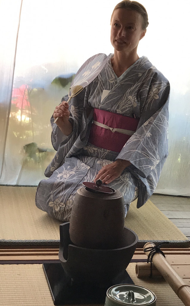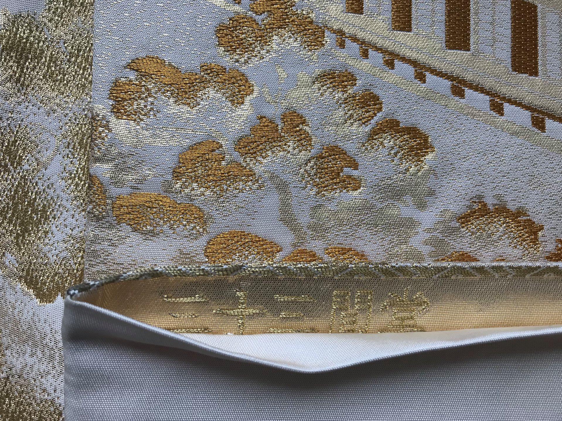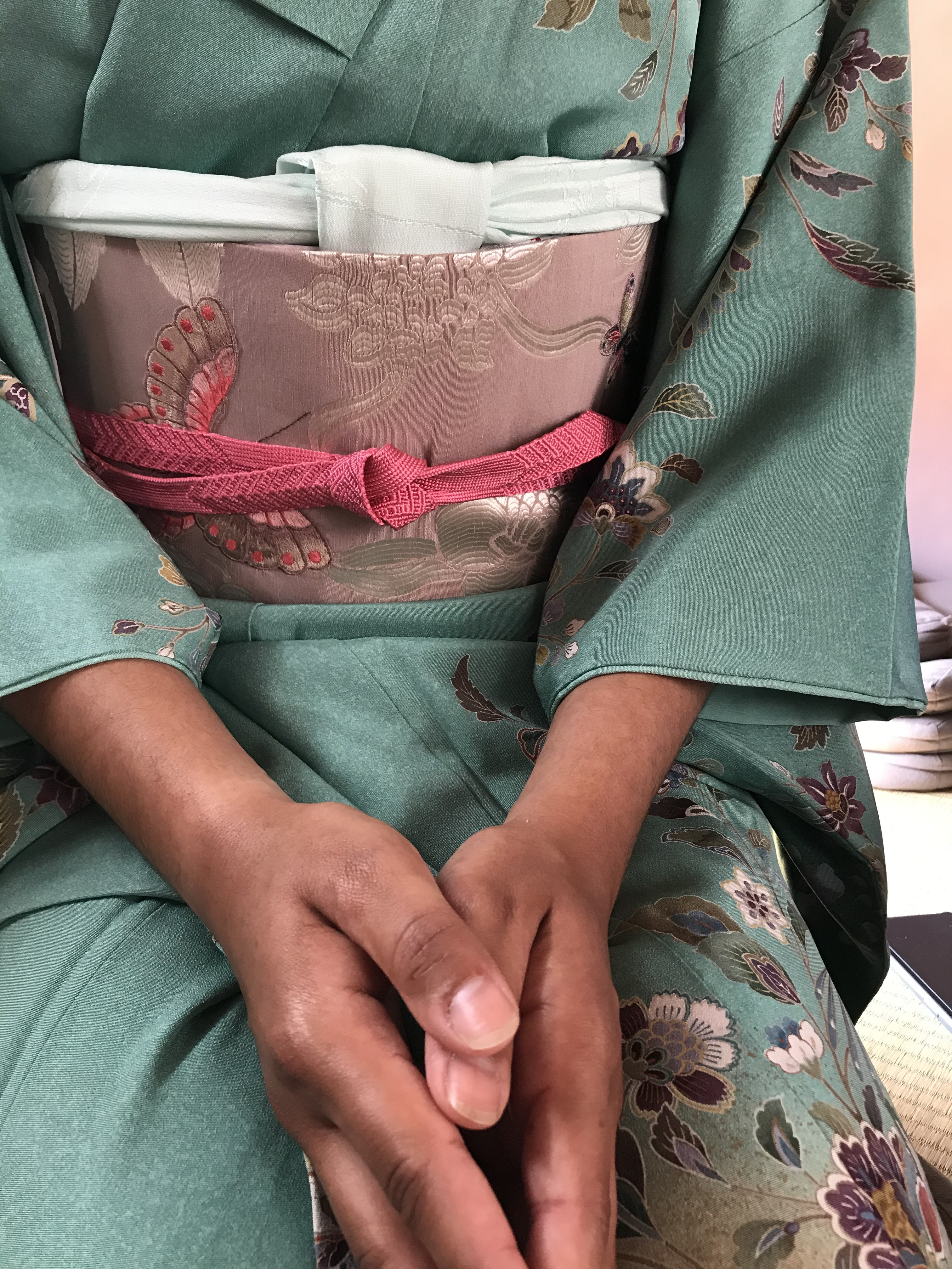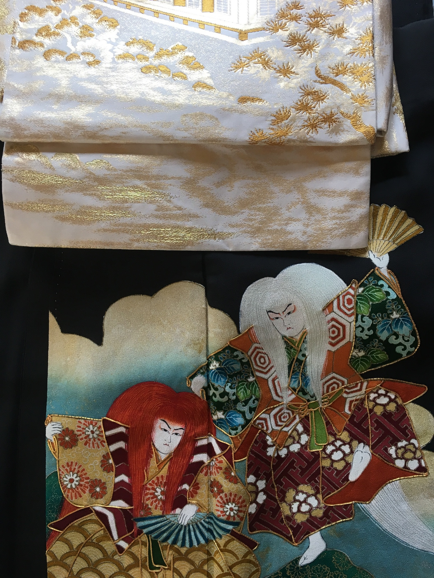 On peut voir sur ce kimono en crêpe de soie lourd, les somptueux costumes portés par les acteurs maquillés. Les maquillages sont très stylisés dans le théâtre de Kabuki et permettent au spectateur de reconnaître au premier coup d’œil les traits principaux du caractère du personnage. Corinne est une habituée de notre atelier Kimono, alors elle a eu un petit privilège pour ce moment solennel : Anita lui a noué un Obi d’exception qu’elle a reçu de son amie Martina pour son anniversaire. C’est un Fukuro Obi, sur lequel est tissée une représentation du temple Sanjûsangen-dô, le bâtiment en bois le plus long au monde. Ce temple est tissé… de fils d’or de 24 carats.