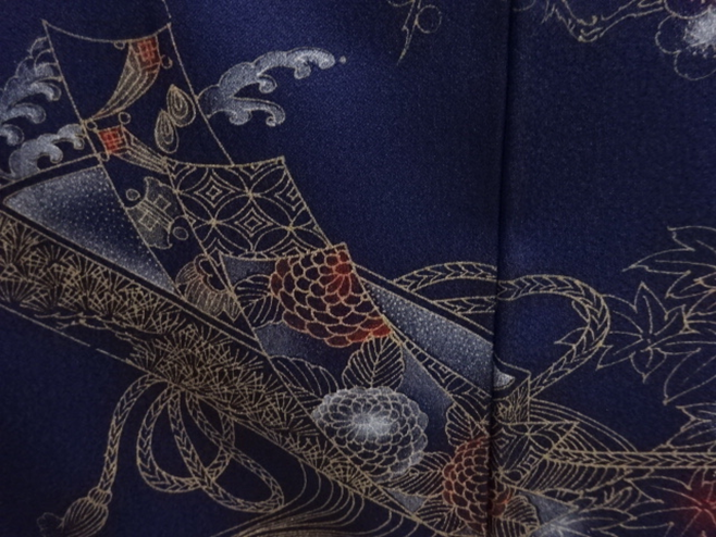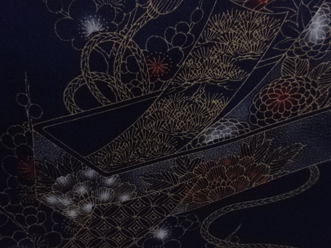 MAMAN D’ELODIE : Kimono Hômongi de couleur bleu nuit, très élégant et sombre à la fois. Sur ce kimono en soie légèrement brillante sont présentés les motifs de Tanzaku, ces petites cartes verticales sur lesquelles sont inscrites des poèmes , parsemées d’or et de motifs de fleurs des quatre saisons aux reflets rouge et blanc. Leur origine provient de l’époque Heian (794-1185). Aujourd’hui encore on inscrit sur une bande de papier coloré son vœu le plus cher ou un poème, que l’on accroche à une branche d’arbre.