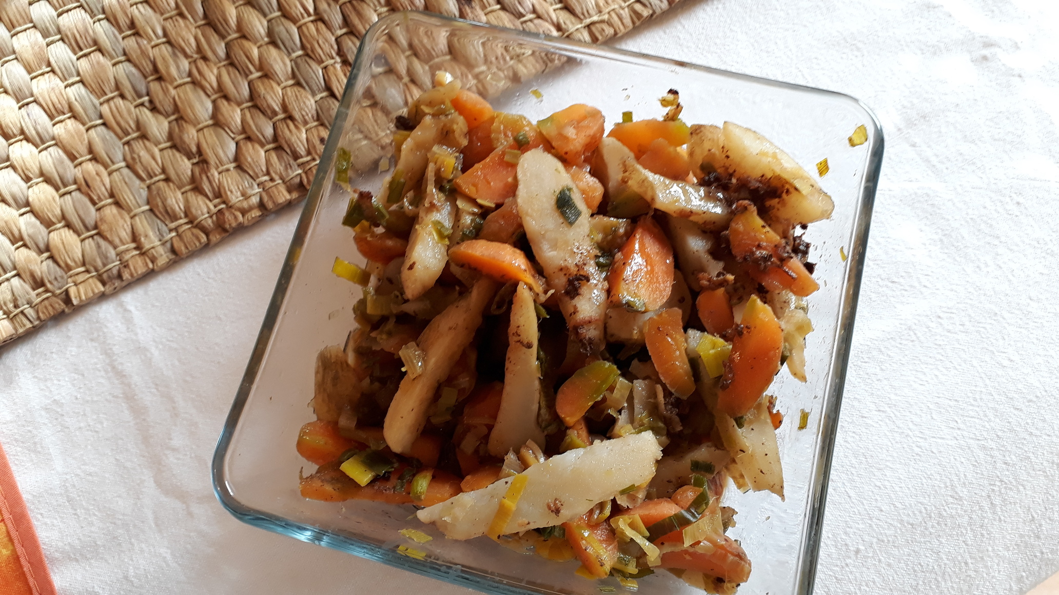 4 carottes, 500g de topinambours, 2 poireaux, 2 cm de racine de gingembre